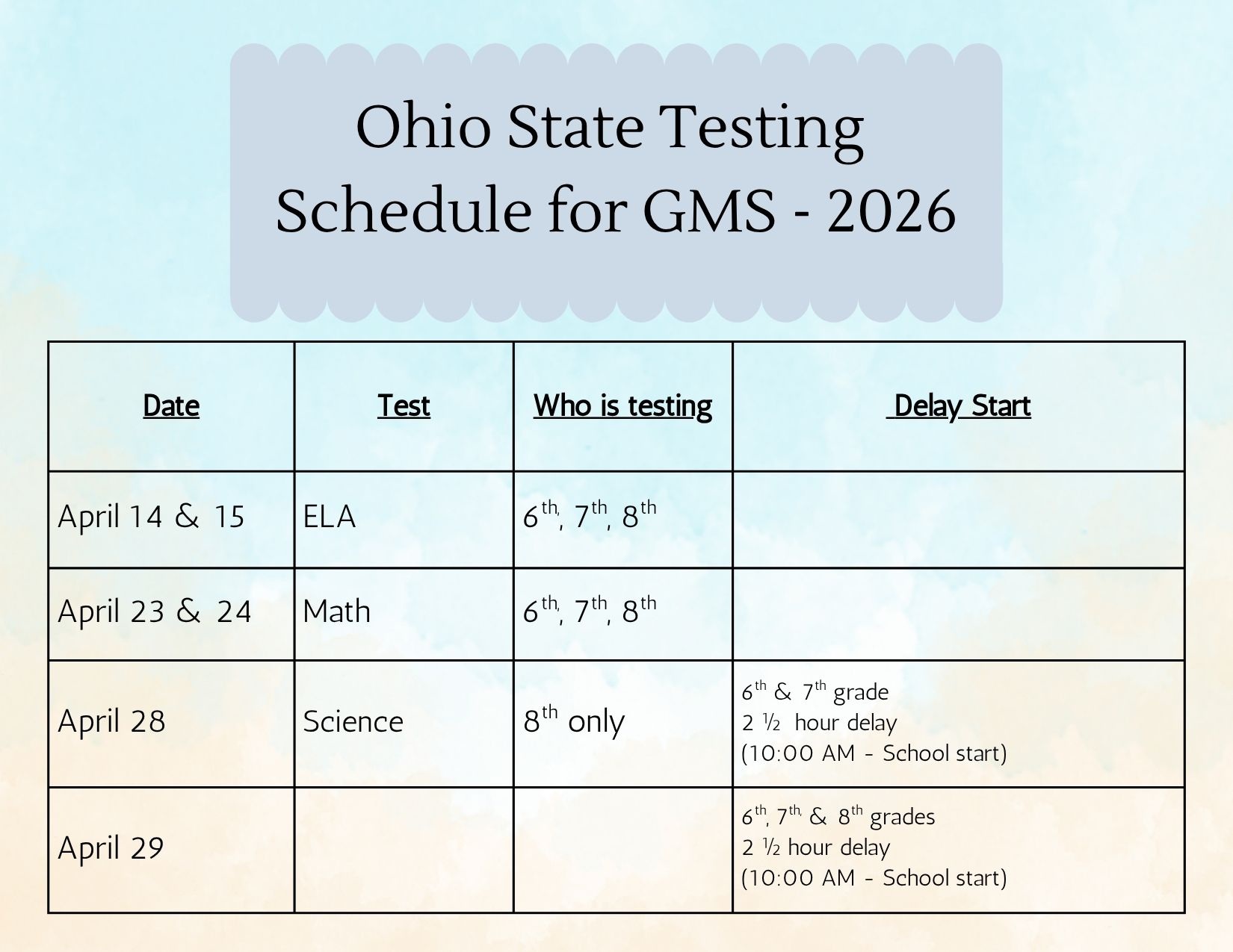 Below is our testing schedule! All students will take the ELA and Math tests. Only 8th graders will take the Science test.